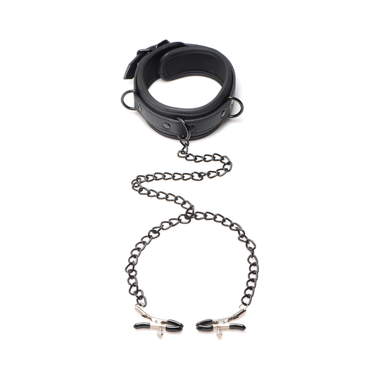 Enjoy turning your submissive lover into a Collared Temptress with this neoprene collar with black chains connected to adjustable nipple clamps! The collar itself has black buckles for a fully adjustable fit and 3 D-rings to attach accessories or chains and restraints to. The center D-ring has black chains already connected that split into two chains, each with a nipple clamp at the end. Each nipple clamp has a rubber tip to protect the sensitive skin tissue and a small screw for precise pressure adjustments. All metal is nickel-free. Have your lover kneel in front of you as you place their collar around their neck. The buckles clasp and you make sure the collar fits snug and comfortably so they can feel the gentle, padded and smooth texture of the neoprene. You take the chain at the center of their throat and pull them gently towards you, making them lift their chest. Taking their nipple in your free hand, you take the clamp and place it slowly behind the nipple, on the areola, and adjust the pressure using the small screw. Doing the same on the other nipple, you hear your lover’s breath catch in their throat and gasp as they begin to mingle pain and pleasure, experiencing it all at your hands. To clean, simply spray with a toy clean and wipe dry. Measurements: Collar adjusts from 12.5 inch to 15.75 inch circumference, Chain length: 22 inches, Nipple clamps open up to 0.5 inches wide Materials: Neoprene, metal, rubber Color: Black, Silver Key Features: Adjustable Collar and Clamps: The neoprene collar has black, metal buckles that can be tightened or loosened for your comfort. The clamps are adjustable via the metal screw so you can tighten and loosen for an exact fit. D-Rings for Attachments: Attach accessories or attach more chains to any of the 3 D-rings located on the collar. The center D-ring has a single chain that then splits into two separate chains and attach to each nipple via the clamps. Soft and Comfortable: The collar itself is comfortable to wear and soft against the skin with a smooth texture and padding. Nickel-Free Metal: All metal is nickel free and body safe.