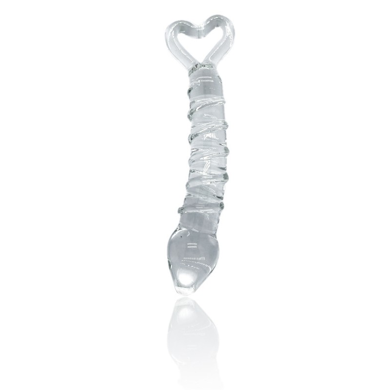 Glass dildo with bold relief ridges on his torso, glans-shaped tip and heart-shaped ring base for even better handling.